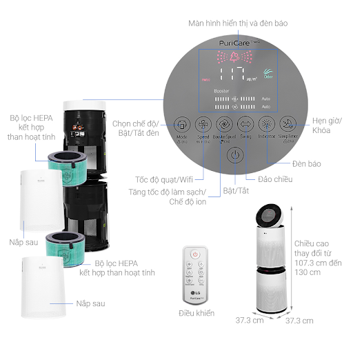 – Chế độ Smart: Điều khiển tính năng tốc độ và luồng khí điều chỉnh tự động theo chất lượng không khí: Booster – tăng cường làm sạch lưu thông khí bằng cách đẩy nhanh không khí đã lọc 1 khoảng xa; Dual chọn dùng đồng thời máy trên và dưới để lọc nhanh hơn; Single điều khiển máy dưới lọc không khí, máy trên vận hành ở tốc độ thấp.