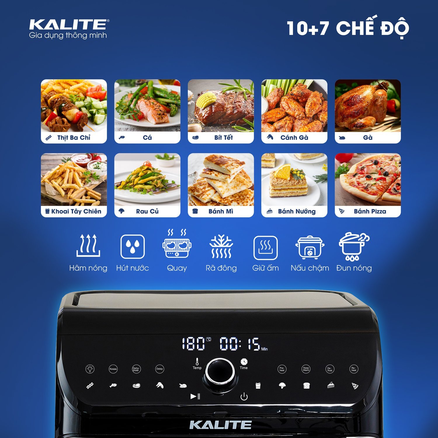 Sở hữu tới 17 chế độ nấu, Nồi chiên không dầu Kalite KL-1200 có thể giúp bạn “nấu cả thế giới” mình mong muốn. Bạn có thể thoải mái nướng thịt, làm khoai tây chiên, nướng gà, cho đến làm pizza, làm bánh, nướng cá, bít tết, nướng rau củ, nướng bánh mì,… Hơn thế nữa, sản phẩm còn được thiết kế 7 chế độ điều chỉnh tay giúp bạn có thể điều chỉnh và chế biến món ăn theo ý muốn bao gồm: Hâm nóng, hút nước, quay, hẹn giờ, rã đông, giữ ấm, làm nóng trước.