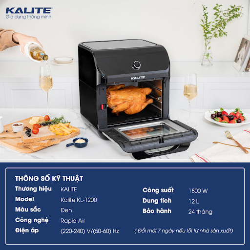 Không chỉ vậy, sản phẩm còn tích hợp 7 chế độ điều chỉnh thủ công thông minh (Hâm nóng, Hút nước, Quay, Hẹn giờ, Rã đông, Giữ ấm, Làm nóng trước) giúp bạn hoàn toàn chủ động điều chỉnh thời gian và nhiệt độ, biến tấu món ăn theo phong cách riêng của mình. Hãy để Kalite KL-1200 khơi nguồn cảm hứng và biến mỗi bữa ăn thành một trải nghiệm ẩm thực đáng nhớ!