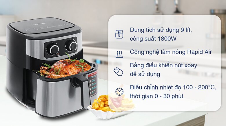 Trang bị công suất lên đến 1800W, nồi chiên giúp làm chín thực phẩm nhanh hơn, tiết kiệm thời gian nấu nướng đáng kể cho người nội trợ. Đây là lựa chọn lý tưởng cho những ngày bận rộn nhưng vẫn muốn có bữa ăn ngon miệng và lành mạnh.