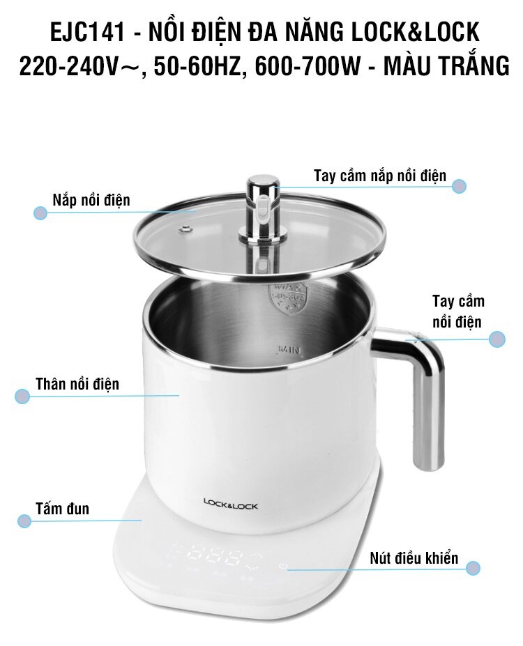 Lock&Lock EJC141 sở hữu kiểu dáng nhỏ gọn, trang nhã với tông trắng thanh lịch, phù hợp cho không gian bếp gia đình hoặc văn phòng. Điểm nổi bật chính là thiết kế đế tiếp điện rời: lòng nồi tháo ra độc lập, giúp bạn vệ sinh dễ dàng mà không lo nước lọt vào mâm nhiệt hoặc dây điện. Đáy đế có thêm chân chống trượt, đảm bảo ổn định ngay cả khi đặt trên mặt bàn hoặc tủ cá nhân.