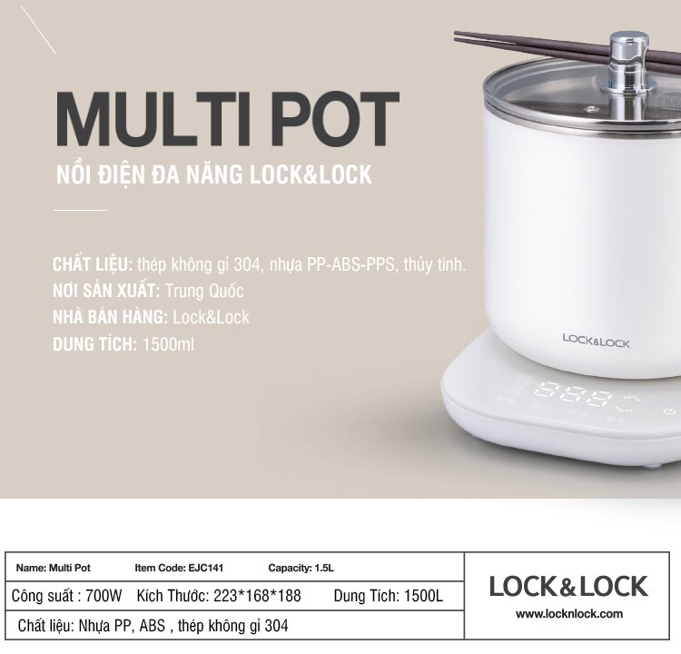 Nồi điện đa năng Lock&Lock EJC141 1.5L có thiết kế hiện đại, nhỏ gọn với chất liệu inox 304 an toàn. Trang bị bảng điều khiển cảm ứng tiện lợi cùng nhiều chế độ nấu như nấu mì, lẩu, hâm nóng… phù hợp cho gia đình nhỏ, sinh viên hay dân văn phòng.