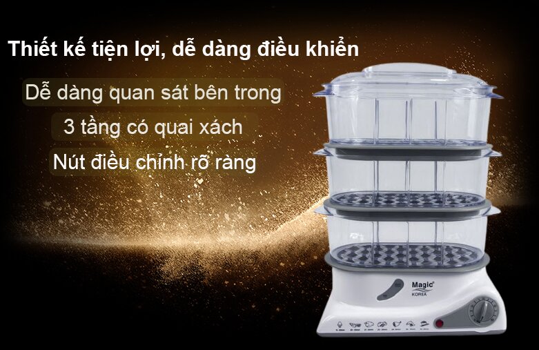 Magic A61 được thiết kế với vỏ nhựa PP cao cấp trong suốt, cho phép bạn dễ dàng quan sát thực phẩm trong quá trình hấp. Thiết kế 3 tầng tách rời, mỗi tầng đều có quai xách tiện dụng, bạn có thể linh hoạt dùng 1, 2 hoặc cả 3 tầng tùy theo lượng thực phẩm cần hấp. Kiểu dáng cao, gọn gàng cùng trọng lượng nhẹ chỉ 5kg giúp di chuyển dễ dàng trong nhà bếp.