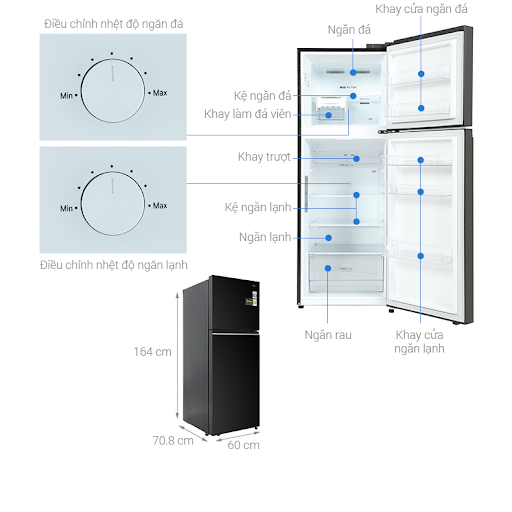 Tủ có các ngăn kệ bằng kính chịu lực và thay đổi vị trí theo nhu cầu người dùng. Thiết kế trên cánh cửa là các khay đựng để tăng không gian dự trữ. Tủ còn có ngăn rau dạng kéo giúp dễ dàng cho và lấy rau củ, giúp giữ ấp tối ưu, cho rau củ tươi ngon, không bị mất nước.